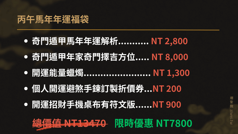 總價值 NT 13470 ,限時優惠3天, 每年僅此一次,現省超過五千元,立即為自己與家人準備馬年新年好運!